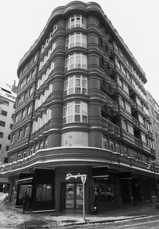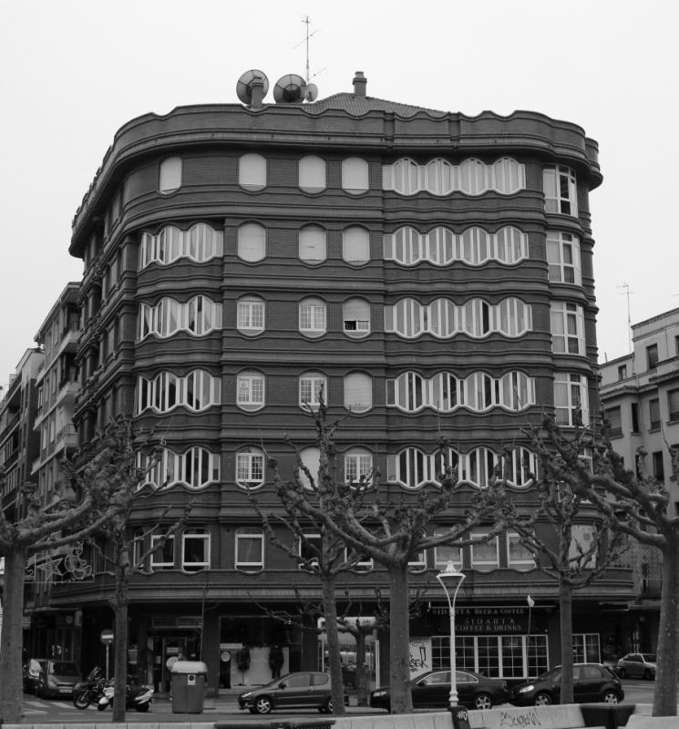 La estampa de este edificio, imposible que pase inadvertida por su ubicación conspicua, es el resultado del alarde en la utilización del catálogo completo de piezas del ladrillo marca La Covadonga -ya desaparecida-, y la elusión en grado obsesivo de la línea recta, complicando hasta la exageración elementos estereotipados de la arquitectura como por ejemplo la ventana.