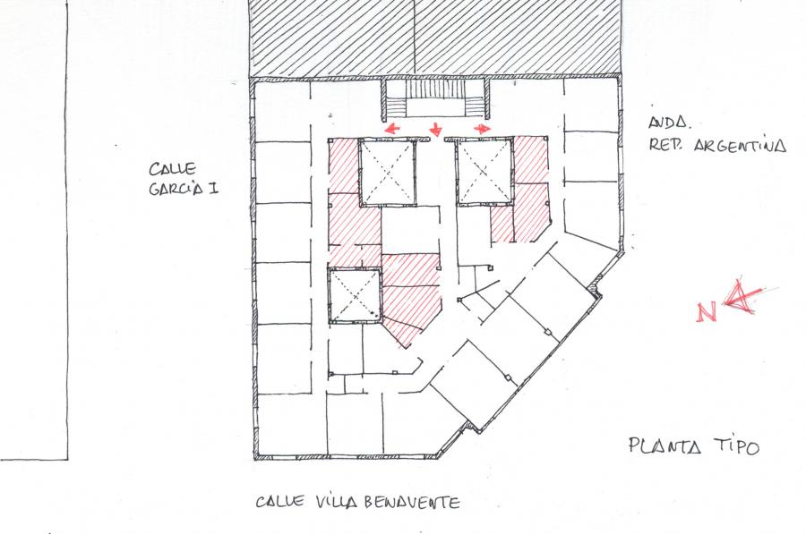 Tampoco echa el resto en el diseño de la planta, perfectamente estereotipada según las convenciones vigentes sobre el espacio doméstico, y que se rige por el principio básico de que la crujía de la fachada, en la totalidad de su desarrollo, se ocupe por estancias habitables. Esta premisa, compartida por buena parte de sus colegas, facilita la tarea de componer los alzados, resueltos mediante la repetición de un hueco-tipo, que en puntos singulares recibe un tratamiento ligeramente diferenciado.