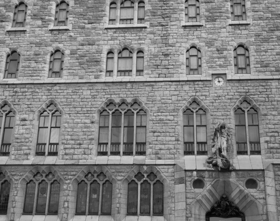 Original en su configuración arquitectónica, por múltiples motivos. El primero, la voluntad de constituirse como un volumen aislado que se escinde de la manzana a la que pertenece, si bien hay que reconocer que esta decisión genera un extraño patio de luces lateral con aspecto de callejón marginal. El segundo, el patio inglés que ciñe el volumen por tres de sus lados. También, el recurso al acabado de sillarejo muy rugoso y desnudo en las fachadas, más propio de los castillos o de la construcción tradicional que de los edificios urbanos. O la cubierta tan inclinada y de pizarra que remite a las catedrales góticas francesas. Por no hablar del diseño de los huecos y sus soluciones de columnillas y arcos mixtilíneos. Todo ello enmarcado por una silueta puntiaguda en la que destacan las singulares ventanas abuhardilladas y, sobre todo, las agujas cónicas de los esbeltos torreones de las esquinas.