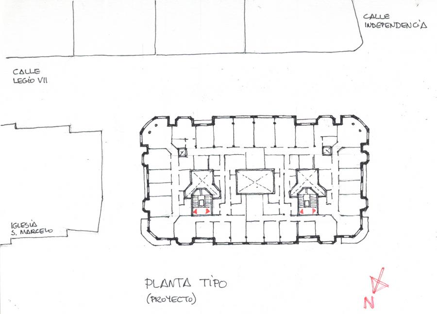Inicialmente, Luis González Roldán presentó al Ayuntamiento un proyecto en planta baja para almacenes y comercio que no ocupaba la totalidad de la parcela. Sin embargo, 2 meses después, se solicita por sus hermanas licencia para construir un edificio de planta baja comercial, primera de oficinas y 5 de vivienda con entrada por la calle Legio VII, al objeto de aprovechar al máximo la planta baja en la fachada a la plaza Santo Domingo.