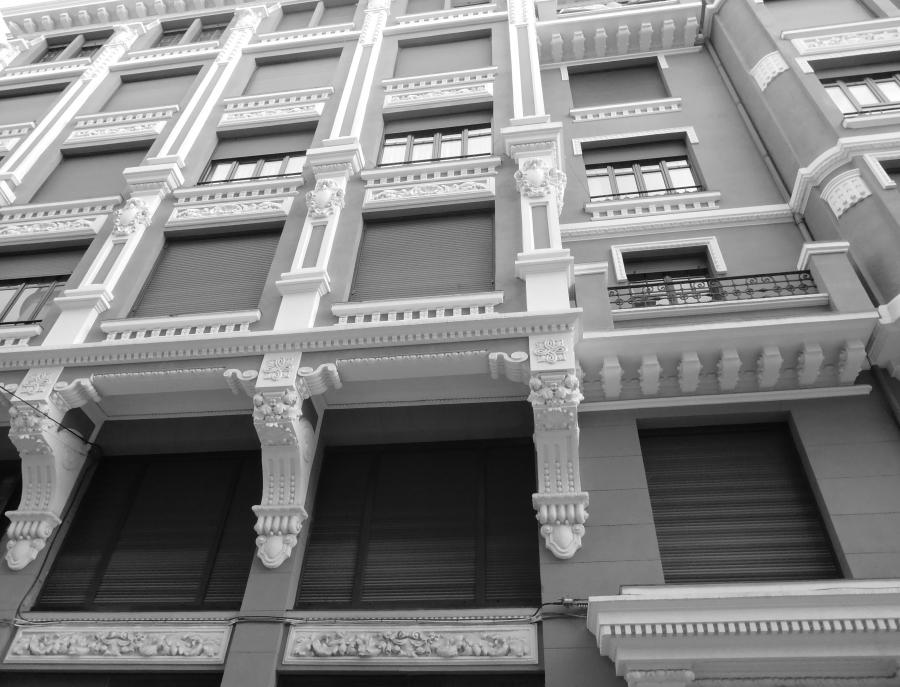 Una paradoja similar se produce en las fachadas pues los cuerpos volados se sostienen sobre unas ménsulas fingidas cuando una de las prestaciones de los forjados de hormigón armado consiste precisamente en la posibilidad de prolongase más allá del plano de fachada sin necesidad de esos elementos auxiliares.