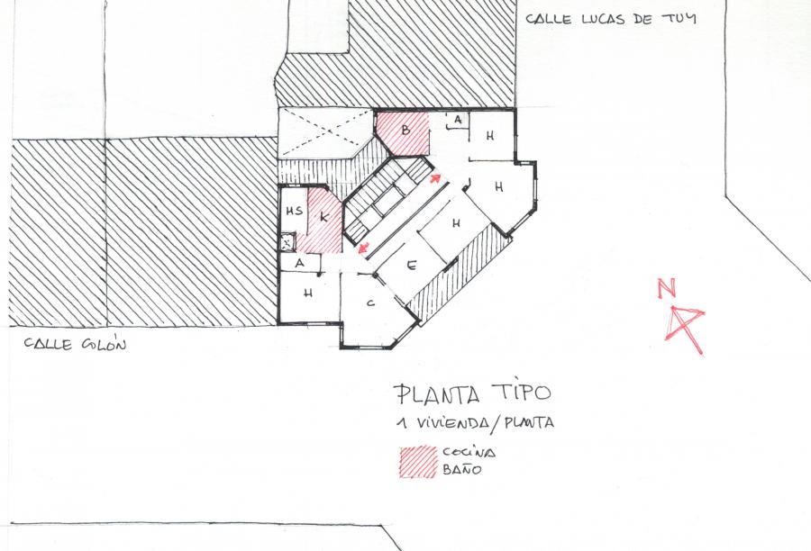 La distribución en planta es aproximadamente simétrica respecto de la mediatriz del chaflán. La escalera, de tres tramos y ascensor en el ojo, ocupa una posición central y la vivienda se organiza en torno a ella siguiendo un esquema muy común en la época, consistente en compartimentar la crujía exterior en una serie de estancias habitables -6 en este caso- de superficies parecidas, entre 10 y 15 m2, mientas que al patio trasero vierten el baño, un pequeño dormitorio de servicio y la cocina, complementada con una terraza tendedero. A su vez, un aseo interno se ventila a través de un patinejo, como era habitual antes de la popularización de los llamados “shunt”.