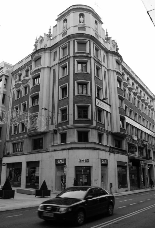 En el proyecto, los alzados juegan al despiste desde el punto de vista funcional pues no traslucen la diferencia de usos. Oficinas y viviendas comparten la misma disposición de huecos que sólo en la planta superior reciben un tratamiento ornamental diferente por simples motivos estilísticos, al objeto de configurar  una franja de remate en la coronación. Durante la obra se modificó el diseño inicial, disponiendo una entreplanta de vanos más grandes, expresión indirecta de la estructura de hormigón armado, que reincide en el equívoco, pues da a entender que sólo en este nivel se dan usos terciarios.