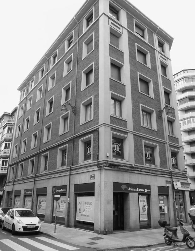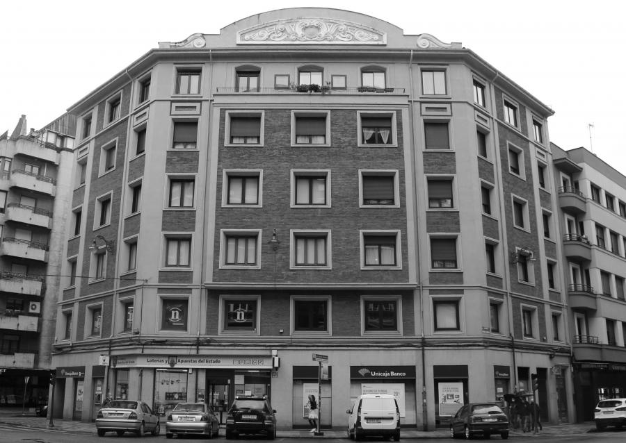 Tampoco echa el resto en el diseño de la planta, perfectamente estereotipada según las convenciones vigentes sobre el espacio doméstico, y que se rige por el principio básico de que la crujía de la fachada, en la totalidad de su desarrollo, se ocupe por estancias habitables. Esta premisa, compartida por buena parte de sus colegas, facilita la tarea de componer los alzados, resueltos mediante la repetición de un hueco-tipo, que en puntos singulares recibe un tratamiento ligeramente diferenciado.