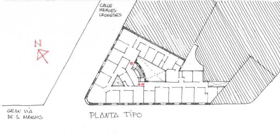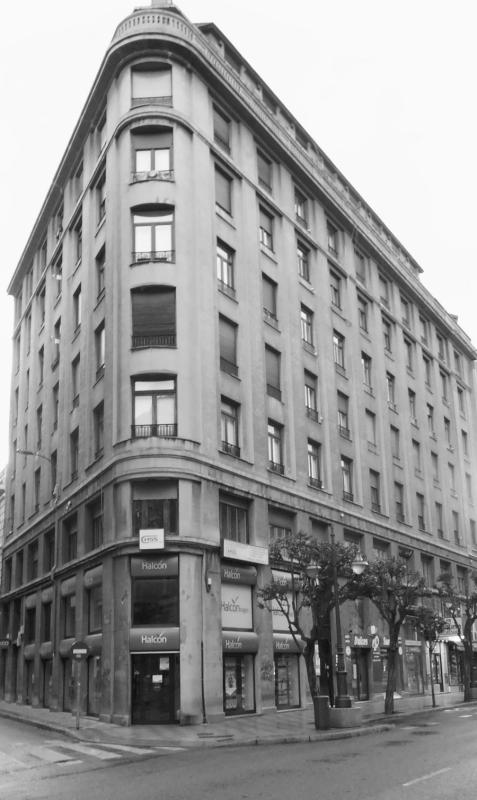 Una década después de proyectar el Hotel Oliden (hoy Alfonso V), Francisco J. Sanz recibe del mismo promotor el encargo de un edificio de viviendas en una parcela contigua por el lado trasero y lo afronta reproduciendo exactamente las alturas, pautas compositivas y acabados del precedente con la clara voluntad de configurar esa pequeña manzana del Ensanche -sólo tiene cuatro parcelas- bajo un principio de uniformidad, poco frecuente, por cierto.
