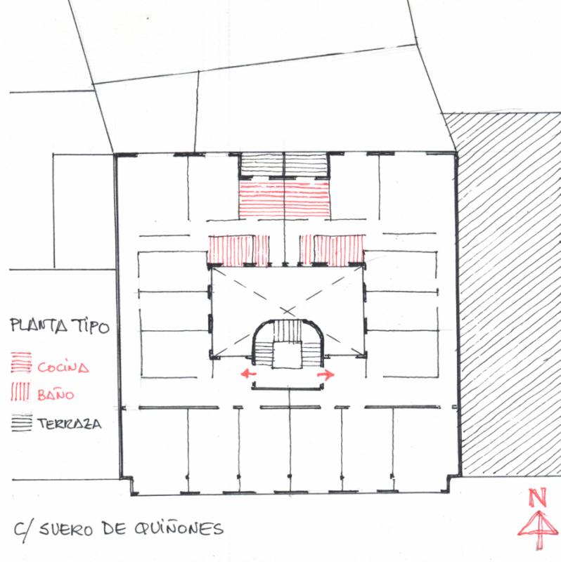 En todo este largo periplo, la organización de la planta permaneció tal cual, sin modificaciones. Dos viviendas por cada piso, en torno a un patio de luces central, articuladas por un largo pasillo en forma C y con las dependencias técnicas (cocinas y baños) concentradas en la parte trasera. Se ve que los materiales empleados en las redes de fontanería eran caros y había que economizar.