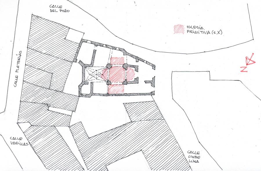 Según la restitución propuesta a principios del siglo XX por Manuel Gómez-Moreno, tomando de referencia las excavaciones realizadas en 1910 bajo la dirección del arquitecto Juan C. Torbado, la primitiva iglesia tendría planta de cruz latina y cabecera orientada a poniente (contra rito) en forma de ábside con traza interior de herradura y exterior cuadrangular. El crucero se coronaba con bóveda de gallones, técnica constructiva característica de la escuela mozárabe.