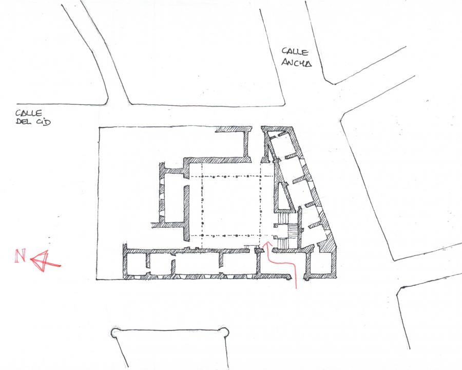 La planta, compacta y con una superficie de 2.430 m2, está muy hábilmente resuelta. Especialmente la sintaxis entre una parcela de forma trapezoidal -el lado de la calle Ancha es oblicuo- y un esquema ortogonal compuesto de patio central cuadrado (15,5 m de lado) y anillo concéntrico que lo envuelve. Esta discordancia se aprovecha para embutir la escalera, elemento muy significado en la arquitectura palaciega, en el resquicio triangular entre uno y otro.