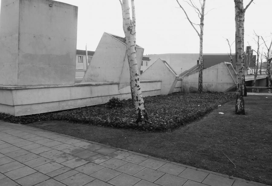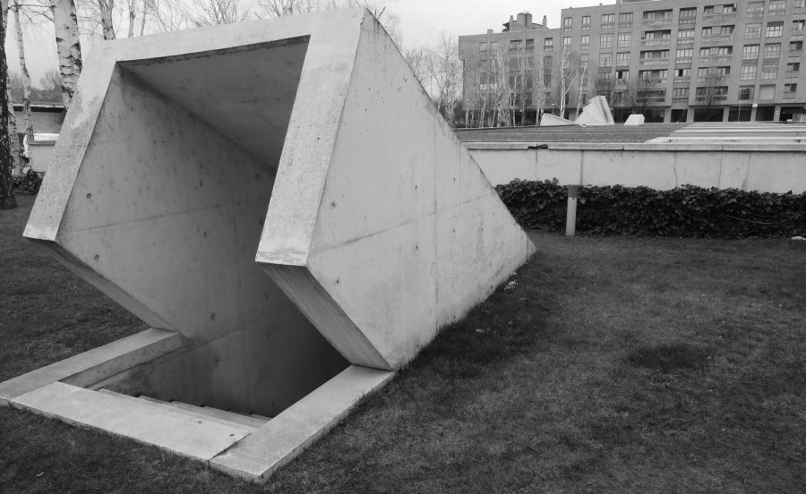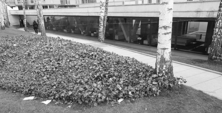 A su vez, el edificio se adosa a la linde oriental, dando la espalda, y abre su gran vestíbulo público hacia el oeste mediante una fachada acristalada que tiene en primer término un talud ajardinado con hiedra rastrera, de fácil mantenimiento, y abedules de corteza blanquecina, una especie muy cara a la arquitectura moderna por influencia de los maestros escandinavos. La presencia del poniente en forma de los rayos rasantes del ocaso, filtrados por las copas de los árboles, añade otra evocación simbólica más, aunque en parte empañada por la construcción al otro lado de calle, en el emplazamiento menos apropiado entre todos los posibles, de un bar que se interpone en la trayectoria del disco solar.
