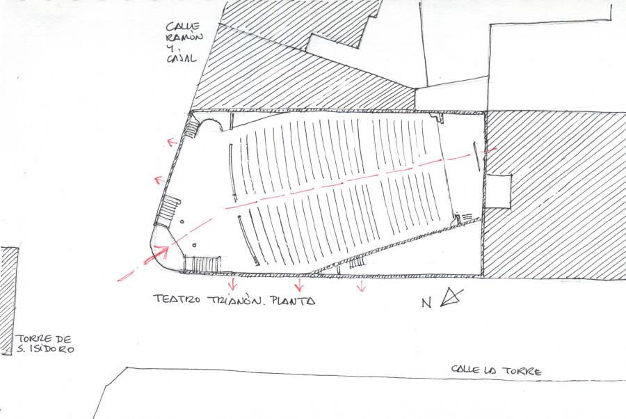 A partir de esta premisa de partida, la decisión esencial del proyecto consiste en la formalización de un edificio aparentemente simétrico respecto de la bisectriz del ángulo de la esquina, opción radicalmente contradictoria con una parcela de forma rectangular y dos fachadas de longitud muy diferente. El recurso utilizado por Sanz consiste en simular la igualdad de ambos alzados mediante la desviación del eje de la sala de proyección, de modo que su cierre por el lado de calle de la Torre -el más largo- no se alinea con la linde, salvo un tramo igual a la longitud de la fachada a la calle Ramón y Cajal. El efecto, se redondea, y nunca mejor dicho, con un chaflán semicircular que elimina la arista de intersección dando continuidad a ambos lienzos.