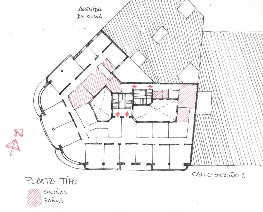 La planta es compacta, alveolada con patios de luces interiores, y crujías paralelas a las fachadas.