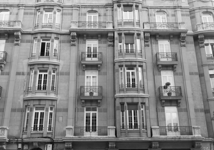 En esta clase de edificios reviste una gran importancia la suntuosidad de las partes comunes. Las escaleras están soladas con placas de mármol enteras, en peldaños y rellanos intermedios. La barandilla es de hierro forjado y el lado de la pared está forrado con un zócalo de madera pintada que incorpora en los descansillos unas banquetas de rincón para reposo de los bultos o del que sube.
