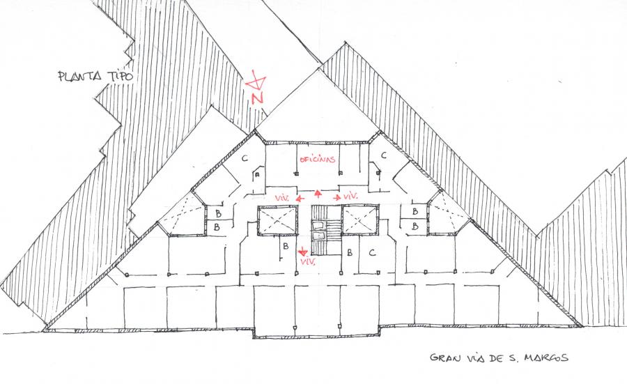 El programa funcional es mixto, de oficinas y viviendas que van entreverándose de modo diferente en los distintos niveles. Así, la entreplanta se dedica por completo a oficinas, las 5 plantas tipo albergan tres viviendas exteriores y oficinas vertiendo al patio trasero, esquema que se invierte en el ático. Como era habitual entonces, el sótano se dedica a usos complementarios de las instalaciones de calefacción, que son individuales.