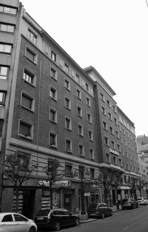 La fachada responde fielmente a los cánones neoimperiales del franquismo de posguerra. Adusta, simétrica, rígidamente geométrica y articulada en la clásica división tripartita mediante la combinación de dos acabados: ladrillo a cara vista en el entablamento y revoco “a la catalana” en el zócalo -que incorpora también la planta principal de oficinas- y la coronación, decorada con una cornisa de perfil curvo y medallones entre los vanos de la planta superior. La axialidad se refuerza con un cuerpo central en voladizo que se prolonga hacia arriba en forma de torreón cubierto a cuatro aguas. Este planteamiento compositivo de carácter netamente frontal, casa malamente con la exigua latitud de la calle, a la que que viene grande su pomposa denominación (Gran Vía), pues no ofrece profundidad suficiente para la contemplación del volumen en su conjunto.