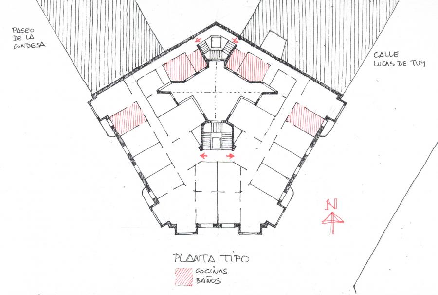 La planta es simétrica respecto de la mediatriz del chaflán y se organiza en torno a un patio interior de contorno zigzagueante para surtir de luz -no mucha- y ventilación a la nutrida colección de estancias que vierten al mismo. Conforme a un criterio de segregación representativa, cada piso alberga dos viviendas divididas en dos áreas -principal y de servicio-, cada una con su propio núcleo de comunicación vertical, compuesto de escalera y ascensor.