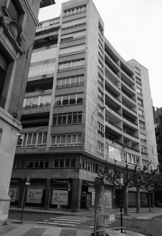 Así por ejemplo, el garage en planta baja -una dotación novedosa para la época-, con acceso desde la calle Ramiro Valbuena y situado en la parte trasera de la parcela, da servicio exclusivamente a las viviendas del bloque de lujo, que también dispone, como otro rasgo diferenciado, de dos núcleos de comunicación vertical con objeto de segregar las circulaciones, confinando las de servicio a una posición discreta. También es más generoso el programa funcional y la asignación de superficies, pues el edificio señorial tiene sólo dos viviendas por planta en contraste con las cuatro de los restantes.