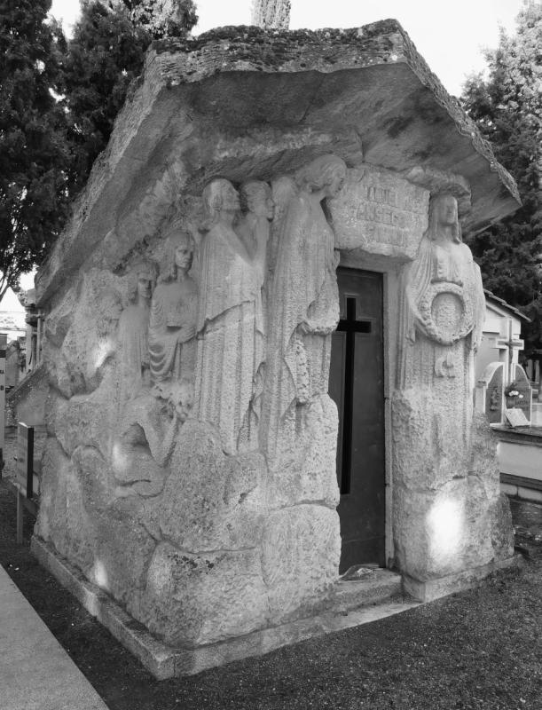 También destila este tono levemente “egipcio” -referencia funeraria por excelencia- el panteón de los Hermanos Maristas, con un remate en forma de gola y un aplacado en bandas horizonales muy estrechas, de dos tipos de piedra.