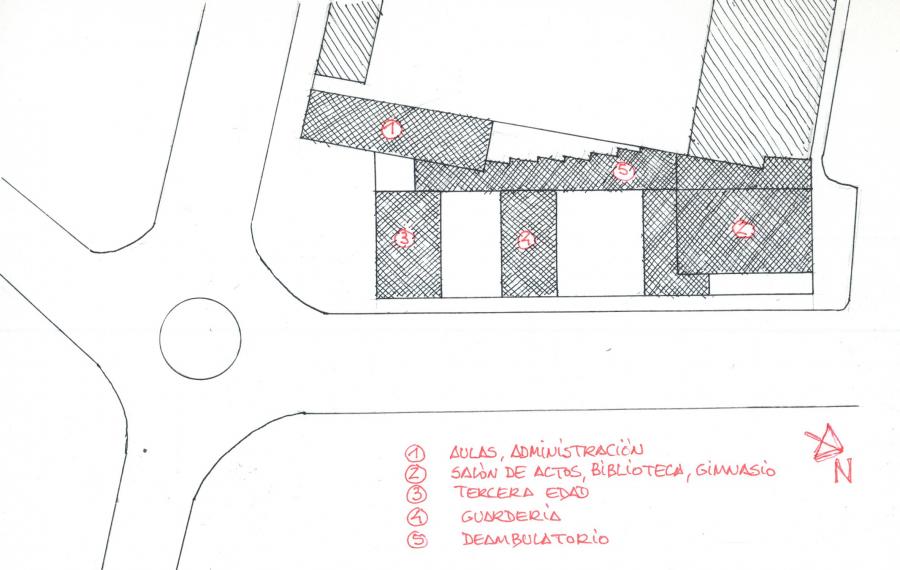 Con una redacción bastante desaliñada, que alimenta el tópico del arquitecto ágrafo, la memoria del proyecto resume los criterios de actuación, basados principalmente en la disposición de diferentes volúmenes, funcionalmente especializados y articulados mediante espacios libres intersticiales. Así, el volumen alto aloja aulas y dependencias administrativas; en el extremo norte se sitúa el salón de actos con la biblioteca encima y un gimnasio debajo; dos de los antiguos pabellones, más bajos, se dedican a guardería y centro de la tercera edad, en una curiosa contraposición entre el inicio y el final de la vida; y, por último, un deambulatorio conecta las distintas partes y sirve de espacio expositivo.