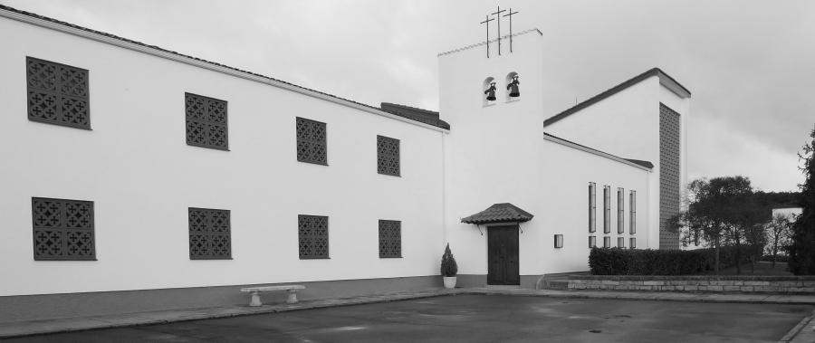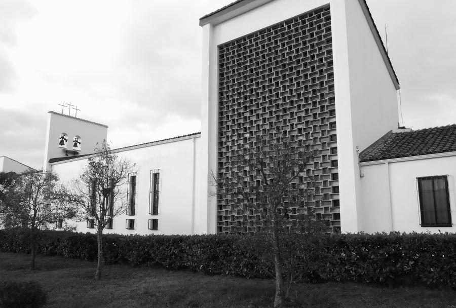 El único contrapunto a tanta modestia es el volumen del presbiterio de la iglesia que levanta por encima del conjunto con una cubierta a un agua, liberando en el alzado de la fachada principal, hacia la carretera, un lienzo esbelto cerrado con una celosía a base de piezas prefabricadas de forma rectangular, que se colocan al tresbolillo.