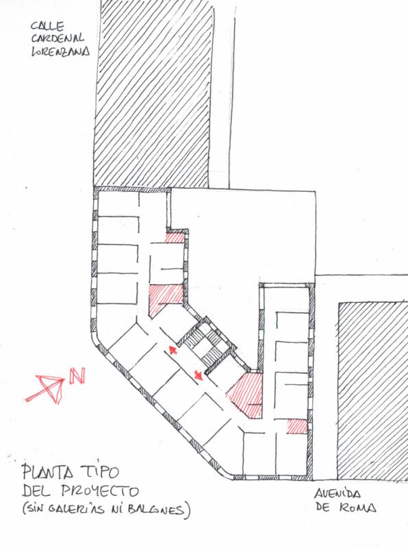 Tipológicamente, el rasgo más característico del edificio es su reducido fondo (8,5 m), repartido en dos crujías definidas por los cerramientos perimétricos y un pórtico intermedio paralelo a la fachada. A partir de este esquema, se organiza la planta con una distribución de dos viviendas por piso y una escalera aproximadamente central, sita en la crujía trasera. Para compensar el menor desarrollo del lado que corresponde a la avenida de Roma, esta ala profundiza perpendicularmente a la calle invadiendo parte del patio de la manzana, solución un tanto forzada, que no es lo mejor del proyecto.