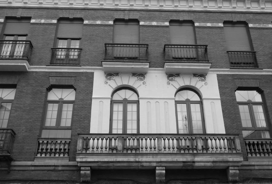 Como casi siempre, J. C. Torbado refuerza la axialidad, en este caso enfatizando el lienzo correspondiente al balcón central de la planta primera o principal con un acabado diferente. El resultado ofrece un predominio de la dirección horizontal; efecto acentuado por la eliminación de dos gaterías acristaladas, sobrepuestas a los vanos extremos, que no pasaron del plano del proyecto a la realidad.