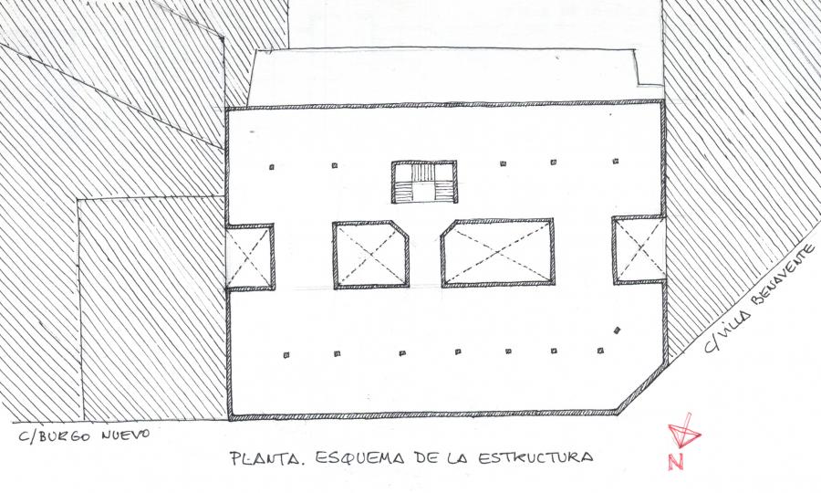 El rasgo más singular de la parcela, con una superficie de 677,33 m2 y forma casi rectangular, es un pequeño mordisco en la esquina de la calle Burgo Nuevo con Villa Benavente que genera un segundo plano de fachada con una exigua longitud de 3,5 m.