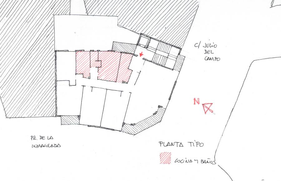 Sobre la misma se yergue un esbelto edificio de 35 m de altura de cornisa, y un ático encima. Esa talla, mucho mayor que la moda del entorno, no desentona del todo vista desde la plaza, pero en la calle Julio de Campo se hace patente en forma de un descomunal muro medianero, revelador de que la ordenación urbanística debiera tomar en consideración no sólo los puntos de vista más favorables para las apetencias de beneficio.