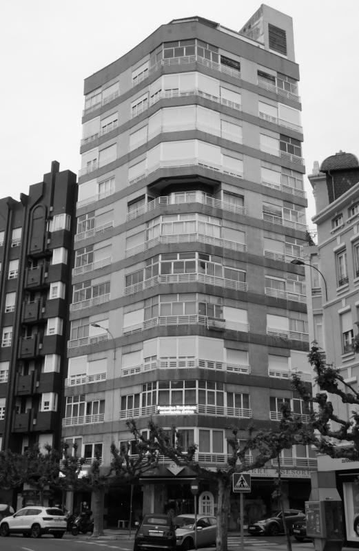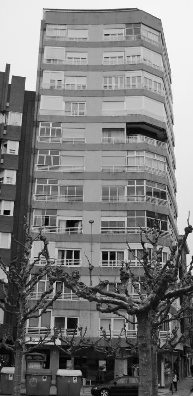 Este inmueble forma parte de la nómina de edificios “en altura”, como se dice en la jerga de los arquitectos, que invadió la ciudad durante la década de los 60 del siglo XX, al amparo de una imaginativa interpretación de las ordenanzas urbanísticas, animada por el afán de beneficio y también por la disponibilidad de técnicas constructivas que la hacía factible. Hoy se ven desmesurados y poco agraciados, pero en su momento representaron el optimismo codicioso de una época tan próspera como socialmente traumática, aunque en todo caso más llevadera que las dos oscuras décadas de autarquía, penurias y represión feroz que siguieron a la trágica Guerra Civil. La promoción, que no se dirige precisamente a una demanda menesterosa, se acogió a la modalidad de “viviendas de renta limitada, Grupo I” que comportaba, entre otros efectos, la bonificación del 90% de las tasas municipales.