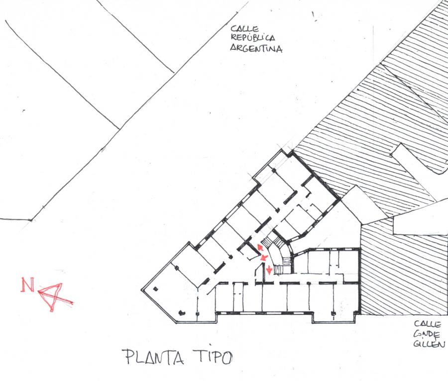 La forma afilada del solar, de 336,59 m2 y casi 47 de desarrollo de fachada, facilita un aprovechamiento casi completo, salvo un pequeño patio de luces interior, con tres viviendas por planta encajadas en un esquema de dos crujías y escalera de tres tramos, situada en el centro de la parcela.