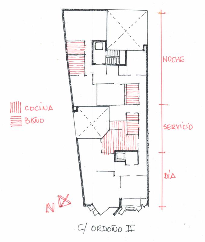 Las características geométricas de la parcela -9,8 m de frente de fachada y 30 m de fondo-, unidas a las exigencias de la normativa sobre la obligatoriedad de verter luces hacia la vía pública, imponían de facto que cada planta albergara una sola vivienda. Con tan exigua medida, no había margen suficiente para que dos viviendas se asomaran sobre la calle de una manera airosa.