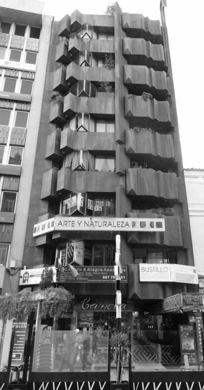 En el aspecto material, la fachada está constituida por paneles ligeros de un color ceniciento, muy oscuro, que confieren al edificio una apariencia mineral, de acantilado volcánico que, para redondear el efecto perseguido, de recreación telúrica, precisaría de una mejor colaboración de los vecinos en el cuidado de la vegetación arraigada en las jardineras, rala e insuficiente a día de hoy. Mucho peor resulta la desconsiderada superposición de un rótulo publicitario que, para más inri, se remite al arte y la naturaleza.