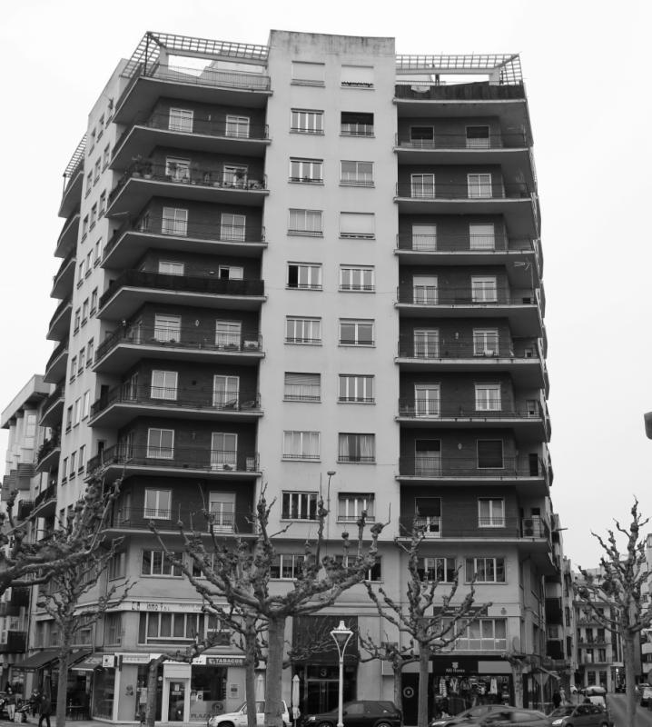 Proyectado un par de años después, este edificio se mira en el espejo del que tiene enfrente -las llamadas casas de Domingo López-, reproduciendo tanto el empaque imponente a través de sus once plantas sobre rasante como la novedosa imagen, basada en el uso de las terrazas a modo de elemento conformador de la fachada, aunque en este caso se sitúan en las esquinas y los extremos de los alzados laterales con el fin de aliviar, en la medida de lo posible, la pesantez de un volumen tan grande.