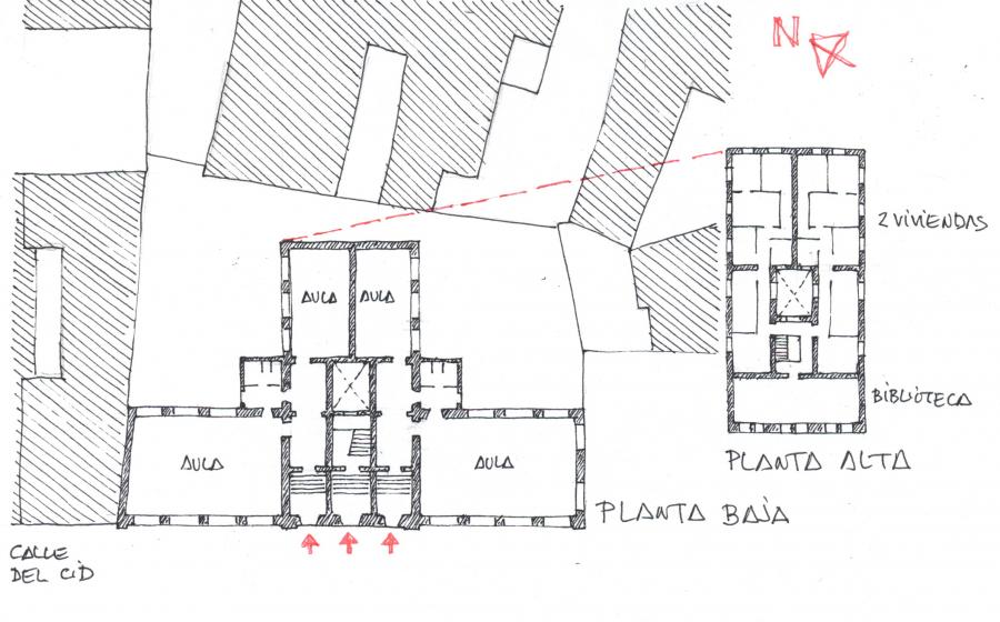 La planta alta sólo se desarrolla en el cuerpo central y consta de una pequeña biblioteca en la primera crujía y dos viviendas simétricas con vistas a los patios de recreo, distribuidas en torno a un patio de luces interior.