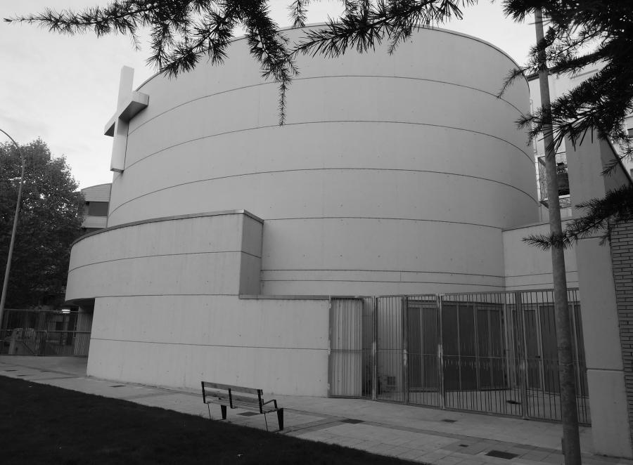 Al exterior, el óvalo se manifiesta con un volumen rotundo y ciego, de hormigón desnudo, que da soporte a una cruz connotativa de la función del edificio, y denotativa de los problemas semánticas de la arquitectura religiosa contemporánea, obligada al empleo de estos recursos iconográficos, dado que no ha llegado a consolidar una tipología reconocible a falta del campanario, reducido en este caso, probablemente por los condicionantes del entorno, a una especie de jaula artística, colgada de un muro lateral, que sólo cumple un cometido simbólico, y a duras penas.