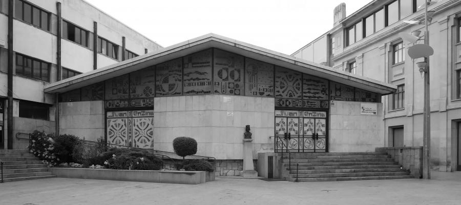 El salón de actos recibe un tratamiento diferenciado y singular con cubierta inclinada, visible desde la calle, sobre un frontispicio descompuesto en dos planos y cerrado con una vidriera moderna, subvirtiendo tácitamente los principios básicos de este elemento de la arquitectura clásica.