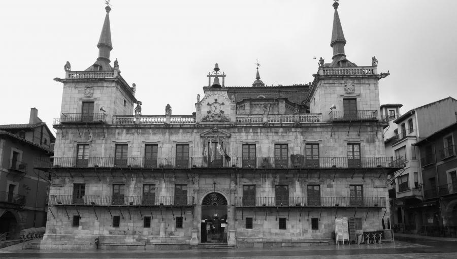 Los torreones laterales se rematan con sendos chapiteles, ceñidos por balaustradas de sillería en cuya cornisa se insertan poderosas gárgolas con figuras monstruosas y de soldados. El eje central está coronado con un reloj construido en el siglo XIX, que sustituyó los escudos trasladados al Consistorio de la plaza San Marcelo. Desde el punto de vista estilístico este edificio responde a estereotipos arraigados en la época de su concepción, que quedaron plasmados con notables concomitancias en los Ayuntamientos de Astorga (1675) y de Ponferrada (1692), por poner ejemplos próximos.