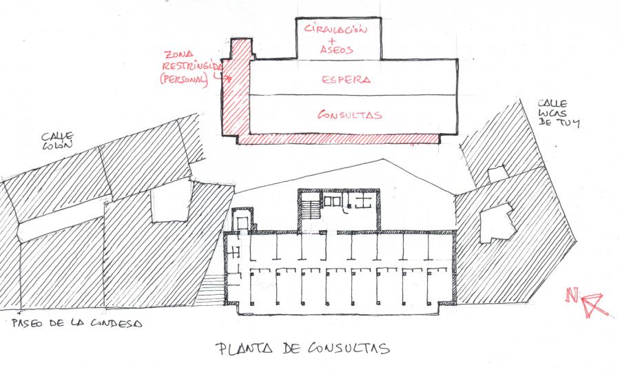 En ese contexto, el edificio se concibe como un objeto básicamente funcional, criterio del que dimana la claridad tipológica y la sencillez geométrica que lo caracterizan. La planta es ortogonal, con la línea de fachada como referencia, y se encaja en la parcela indiferente a la irregularidad de las lindes traseras. Se compone de tres crujías destinadas sucesivamente a una fila de despachos de consulta, salas de espera acompasadas a los mismos y, por último, elementos de comunicación vertical y vestíbulos de planta. La circulación está desdoblada de tal modo que el personal sanitario dispone de un paso discreto e independiente a los despachos, a través de un pasillo antepuesto al plano de la fachada.