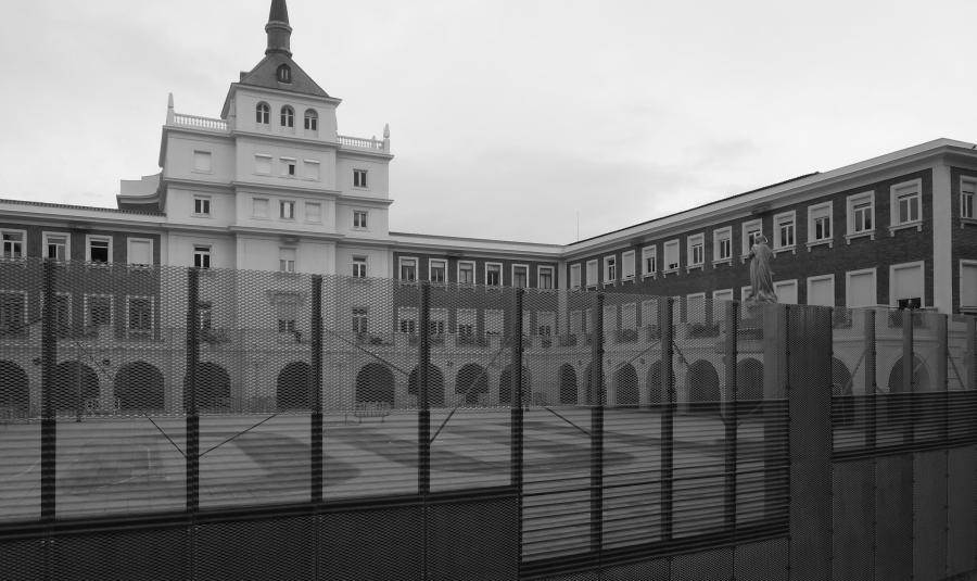 Bien es verdad que este rígido esquema clasicista está encajado con calzador, dada la forma y tamaño de la parcela, pues lo propio hubiera sido una disposición girada 90º, con el eje de la capilla como columna vertebral de la imagen del complejo y los dos brazos laterales abrazando un patio de honor frontal, como ocurre en el Colegio de la Asunción. En vez de esta ordenación, da fachada a la calle un brazo de la H y al recinto porticado se llega lateralmente después de bajar 3,5 m por una inclinada rampa.