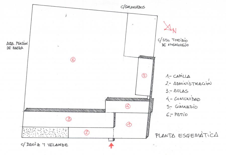 El edificio está descompuesto en cinco cuerpos con forma de paralelepípedo que totalizan una superficie sobre rasante de 4.468 m2, dedicados respectivamente a administración, capilla, gimnasio, aulas, y residencia de la comunidad. Estos dos últimos son los que conforman el núcleo principal del conjunto con tres niveles y una planta en forma de Z, situándose las escaleras, una para cada pabellón, espalda contra espalda, justo en el quiebro. A este volumen se adosan los tres cuerpos restantes, exclusivamente en planta baja.
