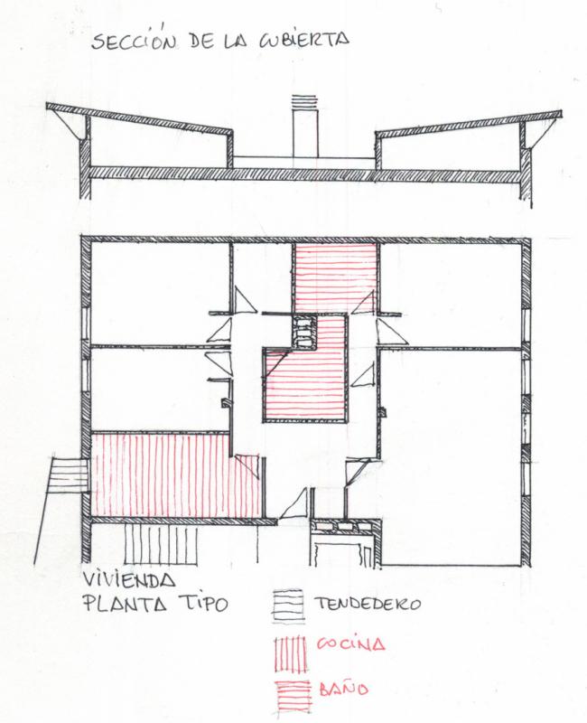 La vivienda tipo es convencional, con el programa estándar de tres habitaciones, cocina, salón y dos baños, pero no se desglosa en zona de día y de noche, como es habitual, con el fin de ofrecer mayor versatilidad funcional. Así, en la crujía delantera se sitúan el salón y un dormitorio con baño propio y en la trasera la cocina y dos habitaciones. En la central, los aseos y un par de dependencias de almacenamiento, necesidad que la oferta inmobiliaria contemporánea ha descuidado sistemáticamente.