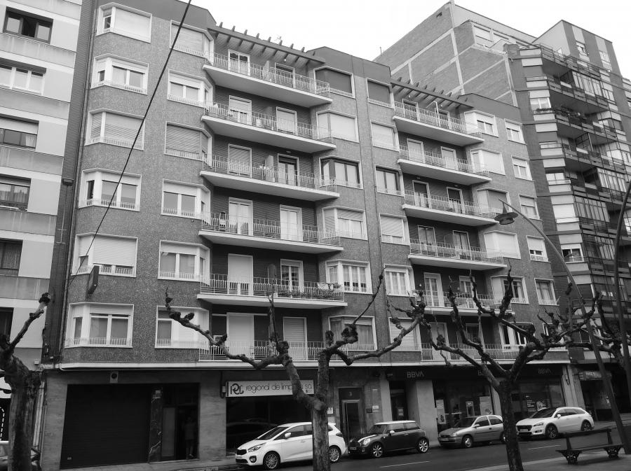 Por su parte, la fachada apunta en otra dirección gracias a las ventanas en esquina, que aligeran visualmente los voladizos, el acabado de teselas vidriadas -conocido como “gresite”- de color verde y, sobre todo, el recurso a las terrazas, un elemento de dudosa utilidad funcional en el extremado clima leonés pero que cumple eficazmente otros propósitos compositivos en búsqueda de una estampa grácil. Cooperan también a ese objetivo las delicadas barandillas de finos perfiles de acero y las pérgolas que coronan las terrazas de la planta superior. Cromáticamente, dos vivos colores, complementarios entre sí -verde y rojo- se alternan en vertical mientras que el blanco unifica los elementos restantes, que son muchos y variados. Por una vez, las alteraciones posteriores han resultado beneficiosas pues indudablemente el edificio gana con las nuevas ventanas de aluminio lacado en blanco aunque choca que algún vecino no haya seguido la pauta general.